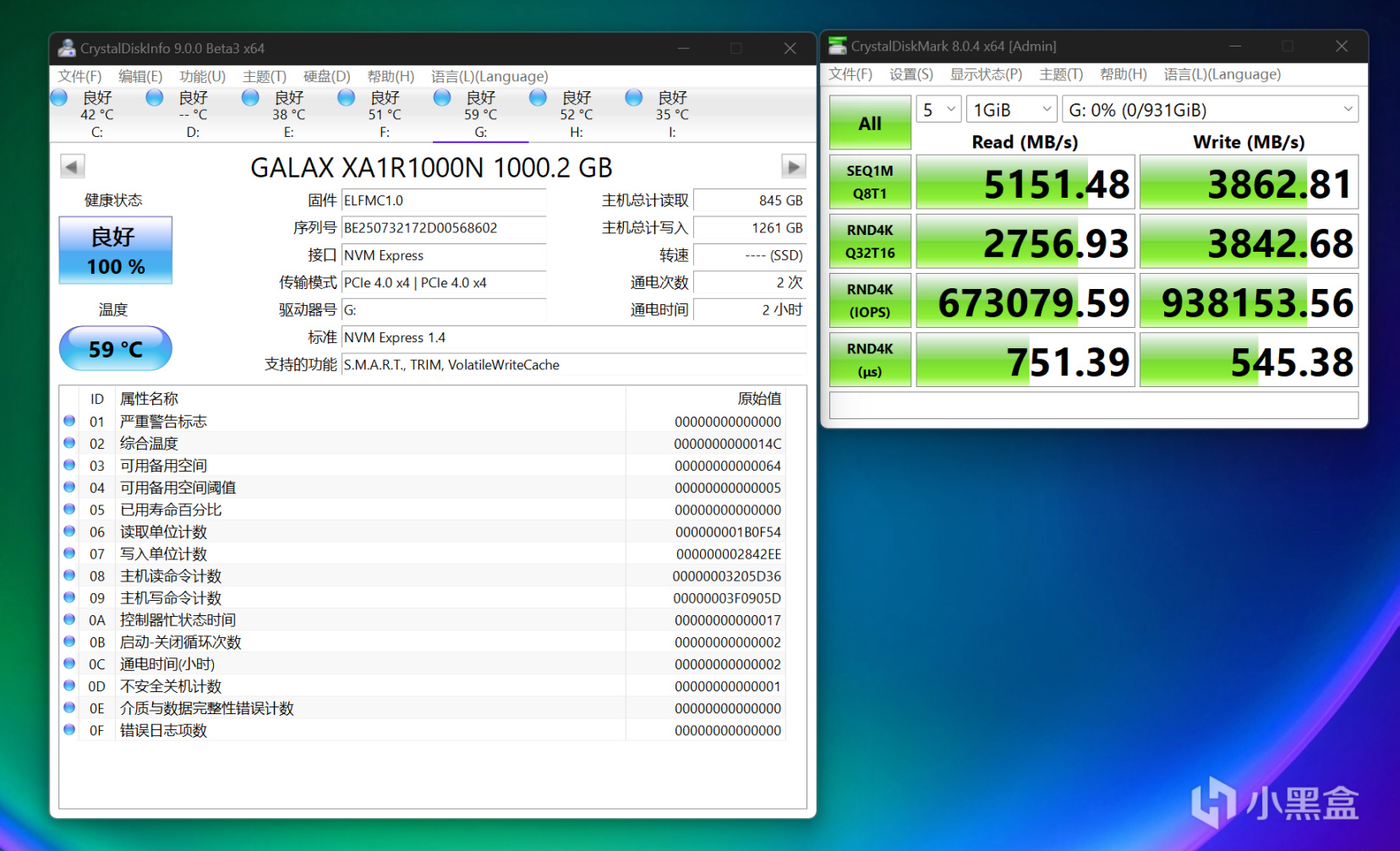 温度测试,在CrystalDiskMark Q8TI项目运行期间,星曜X4 PRO 1TB最高温度稳定在59℃,此时环境是处于封闭机箱中,也有来自主板周边硬件的压力,在有散热片加持情况下,温度表现还可以,所以切记给它加装一个。