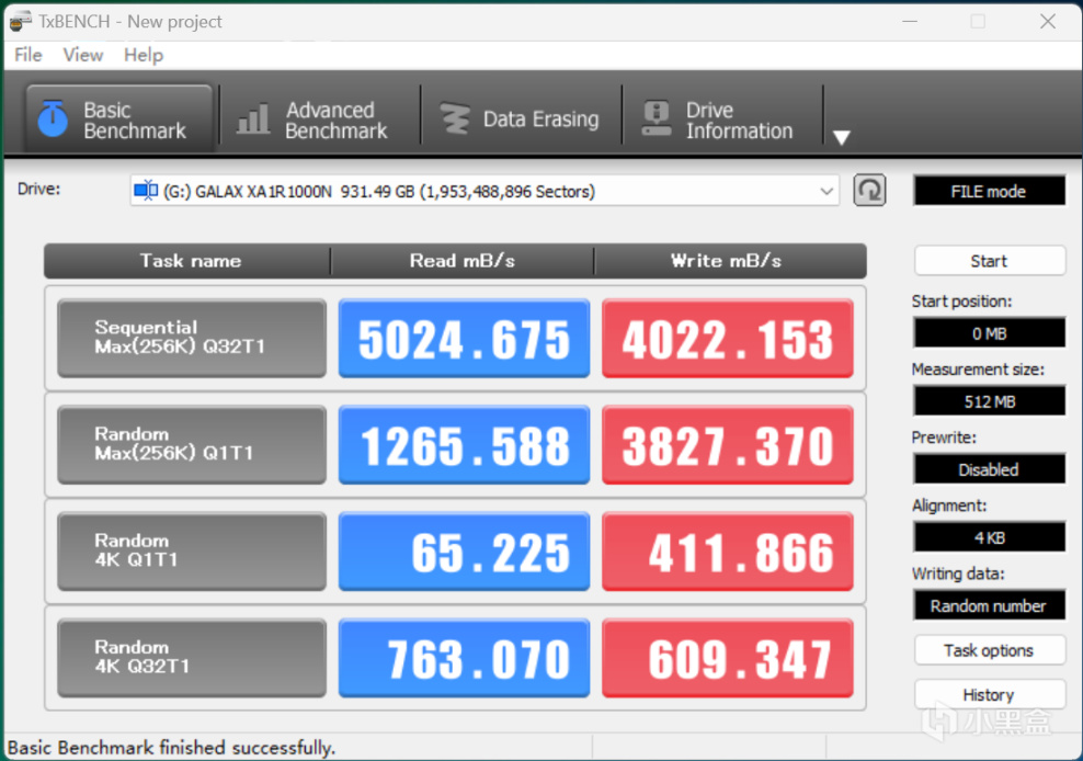TxBENCH测试项目,影驰星曜X4 PRO 1TB的连续读取速度为5024.675 MB/s,连续写入速度为4022.153 MB/s,写入性能是高于CrystalDiskMark项目,而4K读取速度为65.225 MB/s,写入速度为411.866 MB/s。