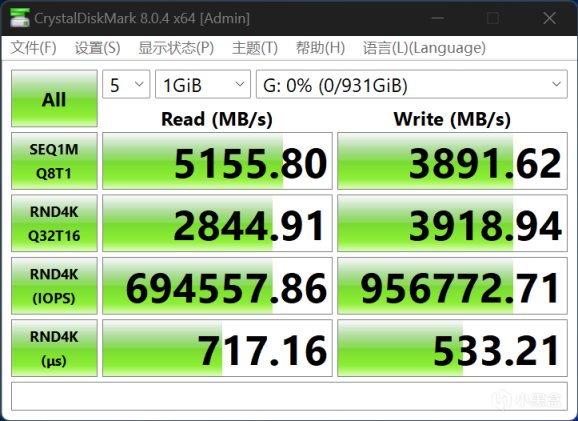 CrystalDiskMark峰值性能Q8T1测试,影驰星曜X4 PRO 1TB的连续读取速度为5155.80 MB/s,连续写入速度为3891.62 MB/s,完美达到官方标称甚至实际写入性能还高了一些。4K随机读写IOPS读写速度分别达到694K IOPS和956K IOPS,4K性能也要比标称高。