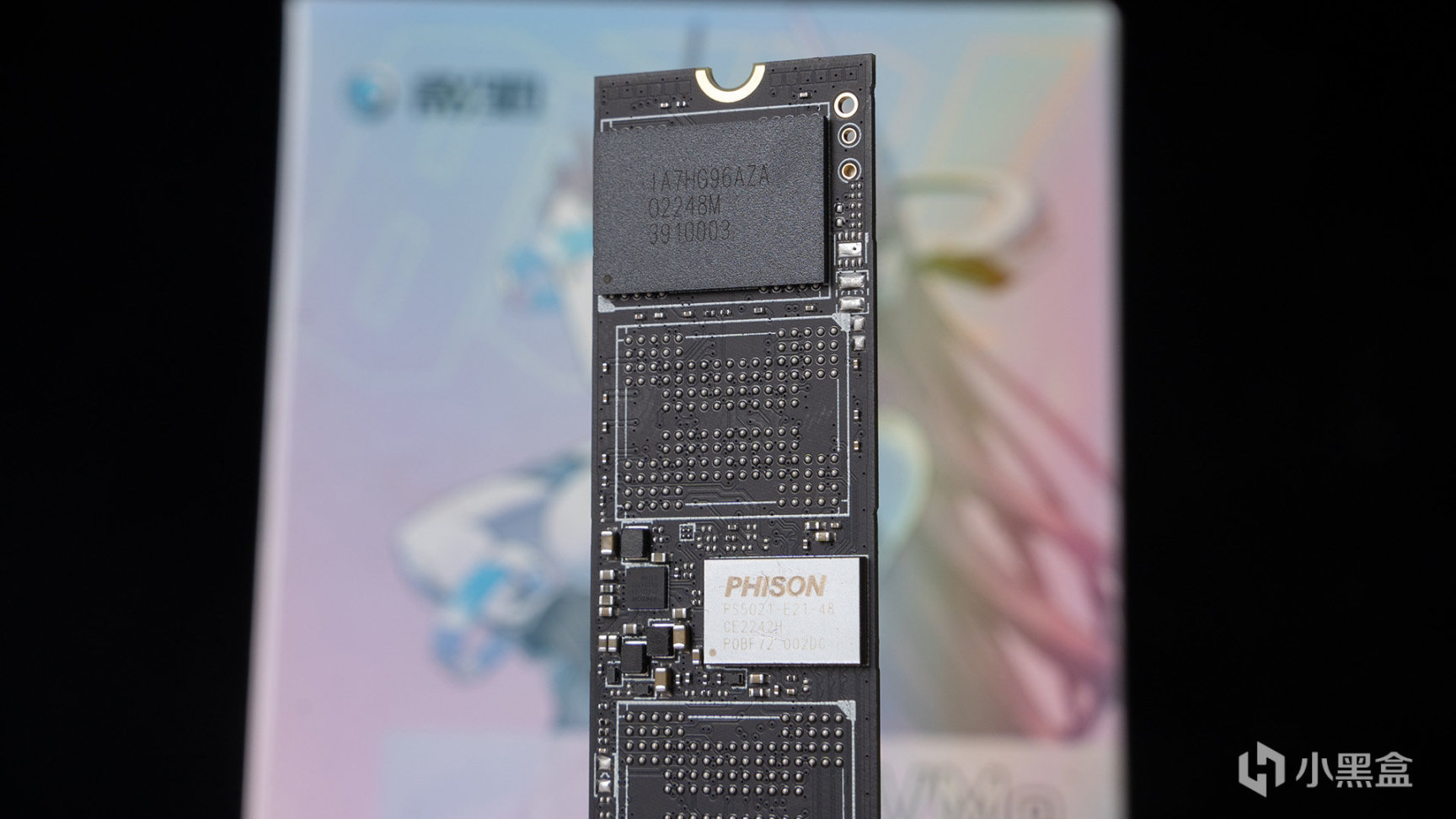 撕开标签贴纸可以看到SSD布局——由一颗群联PHISON PS5021-E21T主控和两颗自封的3D NAND闪存组成,布局设计也有一些变化,主控位于中间位置,而两颗闪存分别位于PCB上下最远端,元件之间相隔较远,散热方面理论上会更好,而空焊位处就是留给2TB版本的。
