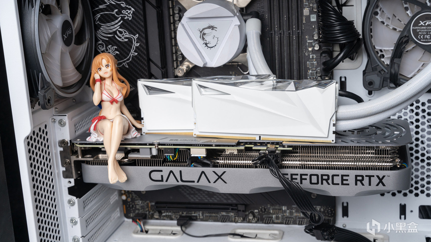 内存也是来自影驰星曜系列的DDR5 6200 16GBX2套装,顶部采用独特的钻石切割透明导光层,内置8颗高亮RGB灯珠,支持1680万种色彩调节,白色铝合金散热片上有冲压成型的切割斜面,颗粒就是来自海力士A-Die颗粒。