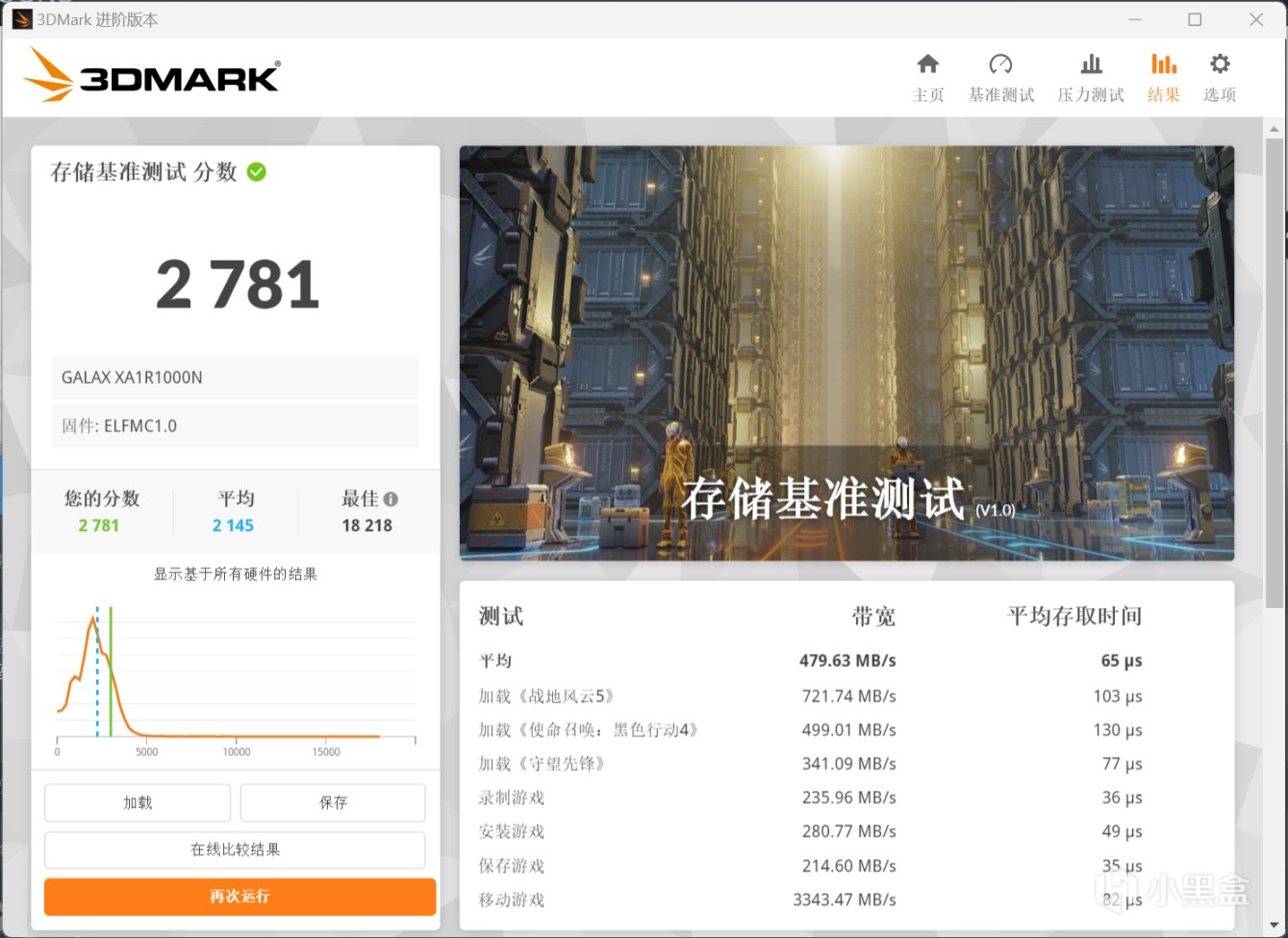 3DMark存储基准测试,这个项目可以真实反映SSD在游戏应用方面的性能,影驰星曜X4 PRO 1TB最终得分为2781,平均传输带宽为479.63 MB/s,平均存储时间65us,就是属于入门级PCIe 4.0的水准。