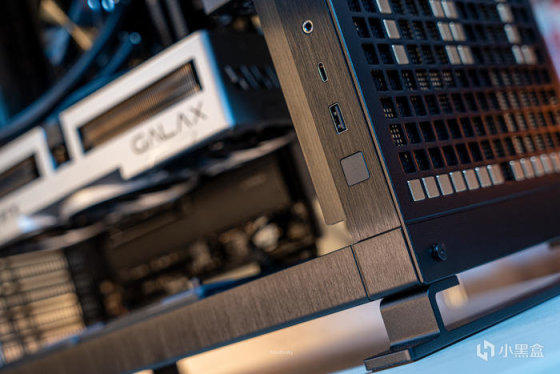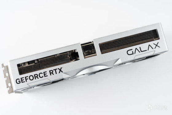 三槽擋板(三槽厚度63mm)沒有全佔頂部空餘3mm,只有60mm的厚度,頂部平整的設計,中間兩個長方形的鏤空出風散熱,左邊GEFORCE RTX,右邊GALAX的影馳logo