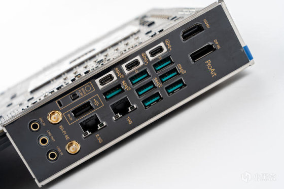 生產力強化的IO背板,滿滿的超強擴展性,最強大的應該是兩個intel JHL8540 USB4接口(40 Gbps 的雙向帶寬),與集顯接口和配件中附帶的線纜支持最多菊鏈五個設備,另外還有兩個集顯接口、7 x USB 3.2 Gen 2 接口、1 x USB 3.2 Gen 2x2 Type-C、1 x USB2.0、10 Gb 和 2.5G 網卡、WIFI6E,BIOS FlashBack和音頻口也是必不可少,可以說將這片小小的IO擋板佈滿了接口