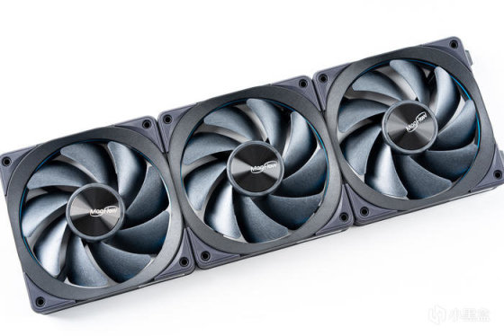 風扇的本體設計非常獨特,這款爲三聯包TRIPLE PACK,風扇雖然爲標準尺寸的12025風扇,不過分量相當十足,應該是得益於其採用的LCP液晶聚合物高分子材料吧,風扇的本體相當壯實,框架比普通風扇厚所以扇葉直徑應該稍小一些,四個螺絲孔位都有硅膠減震墊墊,中間是同心圓銑紋的鋁標上有MagFlow。風扇的參數爲600-2000PWM,噪音值9.9-33.78dBA,風量63.33CFM,風壓2.61mmH2O,FDB液壓軸承,單風扇重212.7g;LCP材質的扇葉紋理非常清晰不同於普通塑料或者POM、PBT材質,相同的樣子可以參考建準代工的T30風扇
