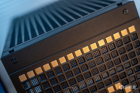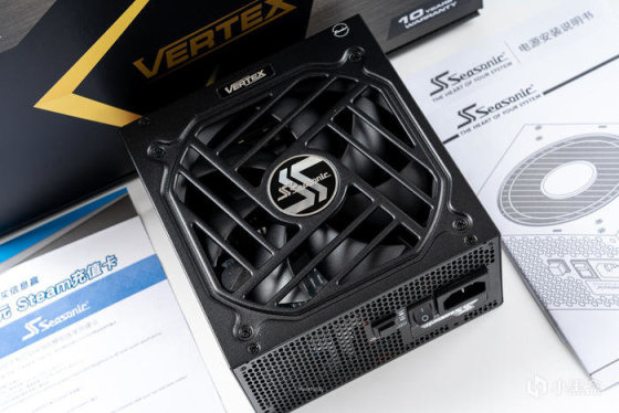 電源的本體,新的風扇進風口爲與整個電源殼體一體壓紋設計,中間爲海韻的LOGO,而頂部有一個型號的logo:VERTEX