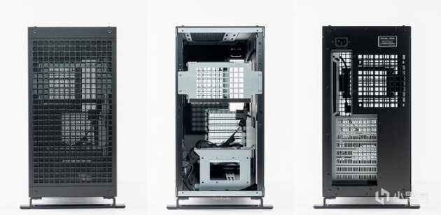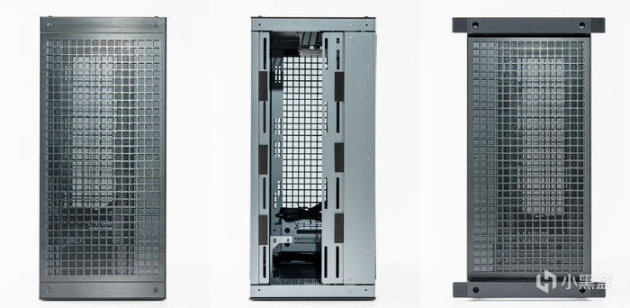 機箱默認方式的像素前面板、打開前面板的內部(電源位可上下移動方便頂部安裝風扇或冷排,下面爲3.5HDD硬盤架),機箱的尾部