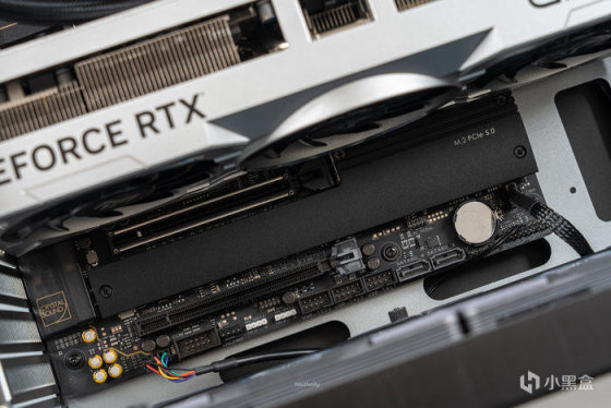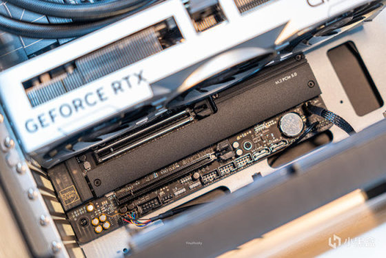 PCIE區域的聲卡爲S1220A,兩條全長的16X PCIE5.0的SafeSlot高強度安全插槽,其中第一條支持PCIe插槽Q-Release顯卡易拆鍵