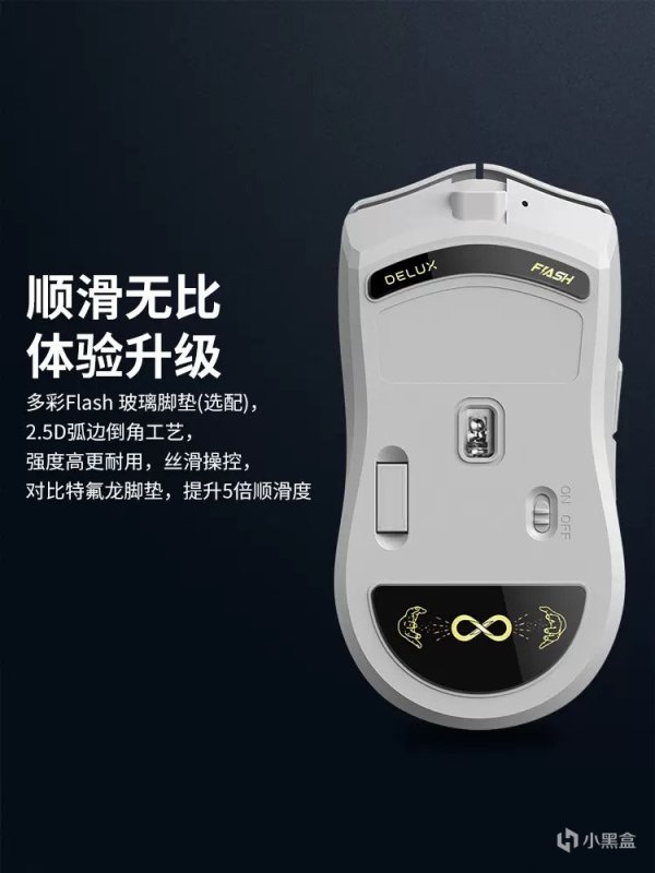 我感觉这款鼠标适合手中等偏小的人群,我手长约为18cm同时还是个小胖手,在我在趴握使用的这款鼠标时候手掌会落在鼠标垫上,要想整个手掌在鼠标上就只能选择抓握了。这些地方其实和每个人的鼠标使用习惯有关。至于鼠标顺滑方面也无需担心。官方还贴心的准备了两套脚贴,其中一套是多彩Flash玻璃脚垫,原料是康宁大猩猩玻璃,相对于常见的特氟龙脚垫,不单单强度更高更耐用,顺滑度也提升了5倍之多,让你用起来如臂指挥。
