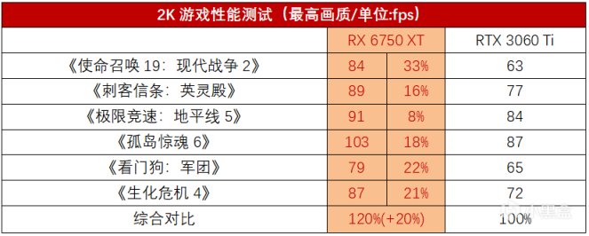 在27英寸2K高刷電競顯示器越來越普及的情況下,越來越多的玩家裝機都開始選擇2K的電競屏,因此玩家在購買主流顯卡時也非常重視2K遊戲性能。2K遊戲性能測試中,不難看出,擁有更大顯存的RX 6750 XT的優勢更明顯了,平均領先幅度達到20%。在《使命召喚19》中,RX 6750 XT強了33%,《看門狗軍團》《生化危機4》強了21%以上。幀率方面,RX 6750 XT依然可以達到80fps以上,而RTX 3060 Ti就比較乏力了,多款遊戲在60~70fps左右,RX 6750 XT穩定拿下2K遊戲。