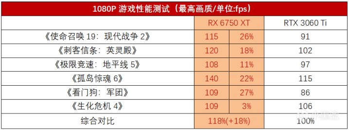 在1080P分辨率下,兩款顯卡都有最高畫質“破百幀”的實力,不過RX 6750 XT的遊戲幀率顯然比RTX 3060 Ti高一些。RX 6750 XT在參測的所有遊戲都能跑到100fps以上的幀率,其中《孤島驚魂6》的幀率高達140fps,最低的《地平線5》也有108fps,反觀RTX 3060 Ti僅有三款遊戲超過了100fps。從領先幅度來講,RX 6750 XT平均比RTX 3060 Ti強了18%,最大領先幅度超過27%,優勢相當明顯。