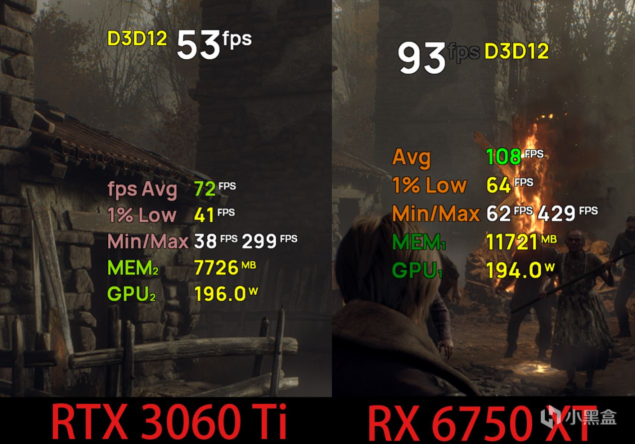 而《生化危機4》在我們測試流程到達廣場之後,顯存佔用會突然從7GB~8GB暴漲至10GB以上,“炸”顯存的後果體現到遊戲裏就是幀率大幅下降,幀率直接掉到了60fps以下,所以用RTX 3060 Ti測試《生化危機4》時,成績只記錄到廣場之前。使用RX 6750 XT到達廣場後的幀率則影響不大,此時顯存佔用超過11GB。對有經驗的玩家來說,兩款顯卡的區別可能只是2K分辨率特效拉滿和需要手動調整的區別,但大配置顯存的RX 6750 XT不論是高分辨率遊戲的幀率還是穩定性表現更好是毋庸置疑的。