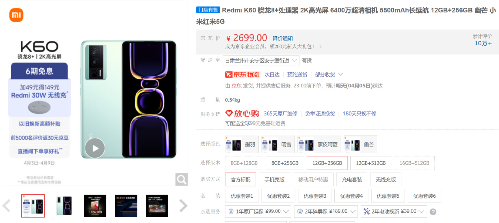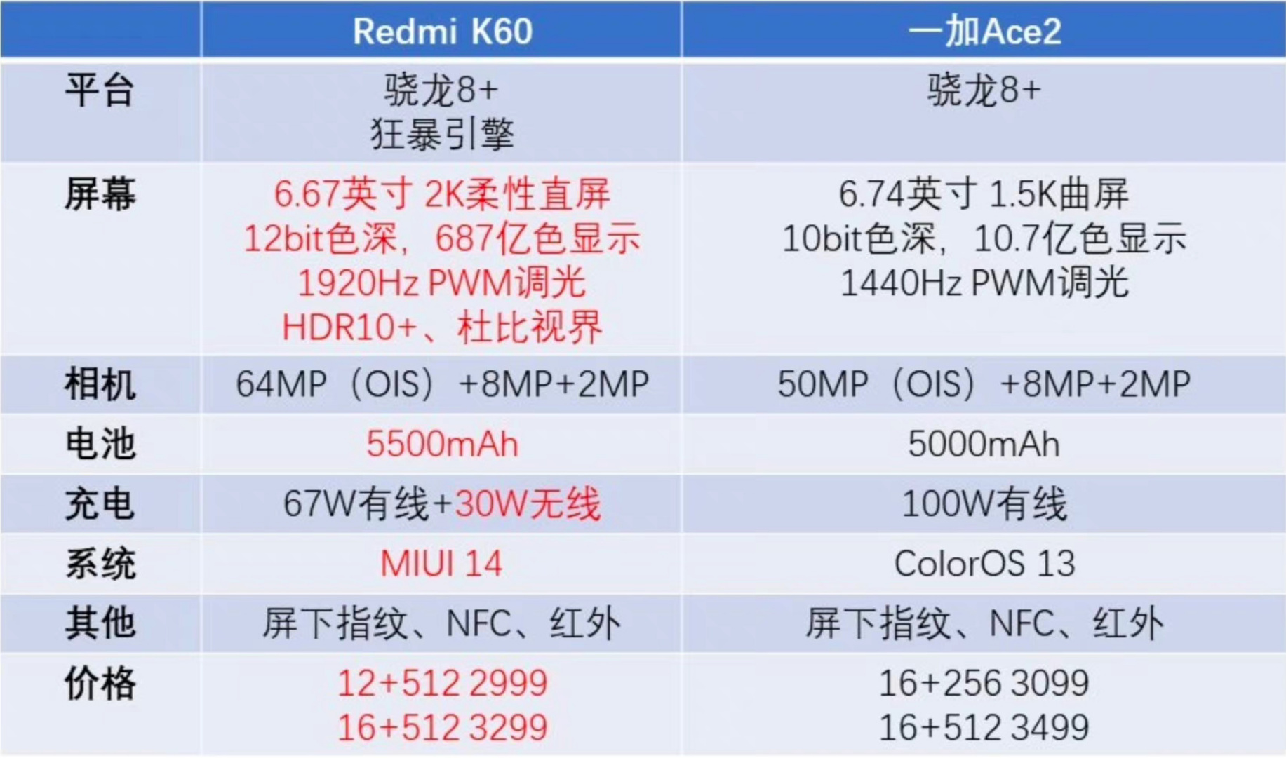 同12+256配置,一加Ace2零售價2799,紅米K60零售價2699