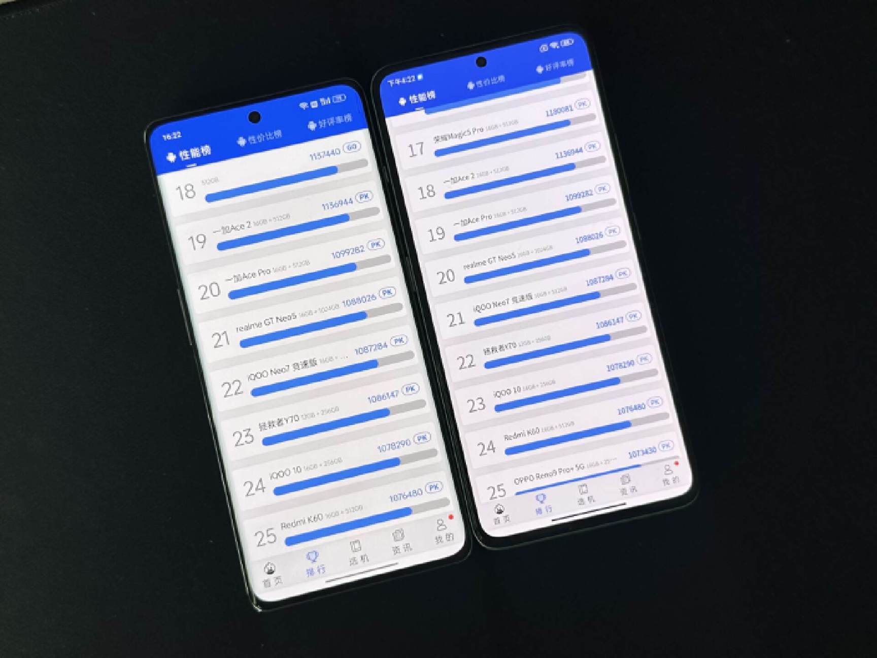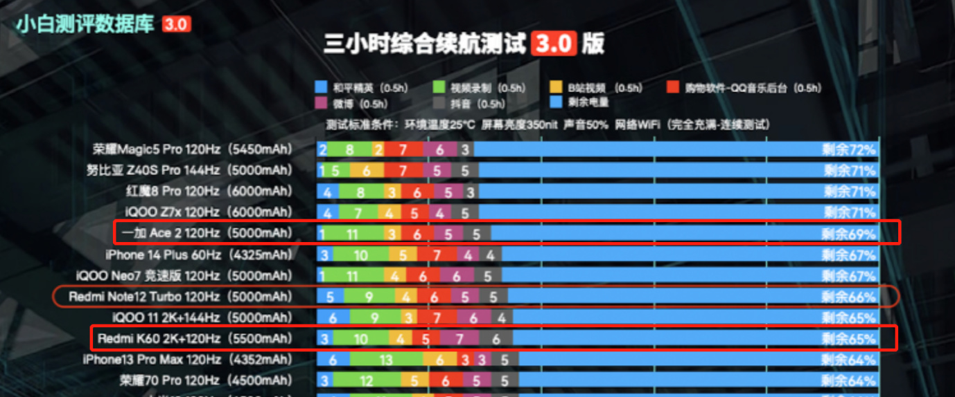 在安兔兔性能排行榜上,一加Ace2排名18,紅米K60排名24,還是存在一定性能差距的。看到這個我就想起來之前紅米note12 Turbo發佈會上的競品對比圖,搭載二代驍龍7+的note12 Turbo性能居然可以勝過一加Ace2,也不知道是如何得出來的結論。