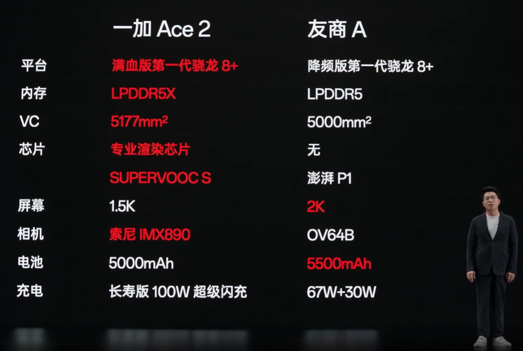 而一加Ace2發佈會上跟友商A機型的參數對比,一加Ace2優勢更多一些。