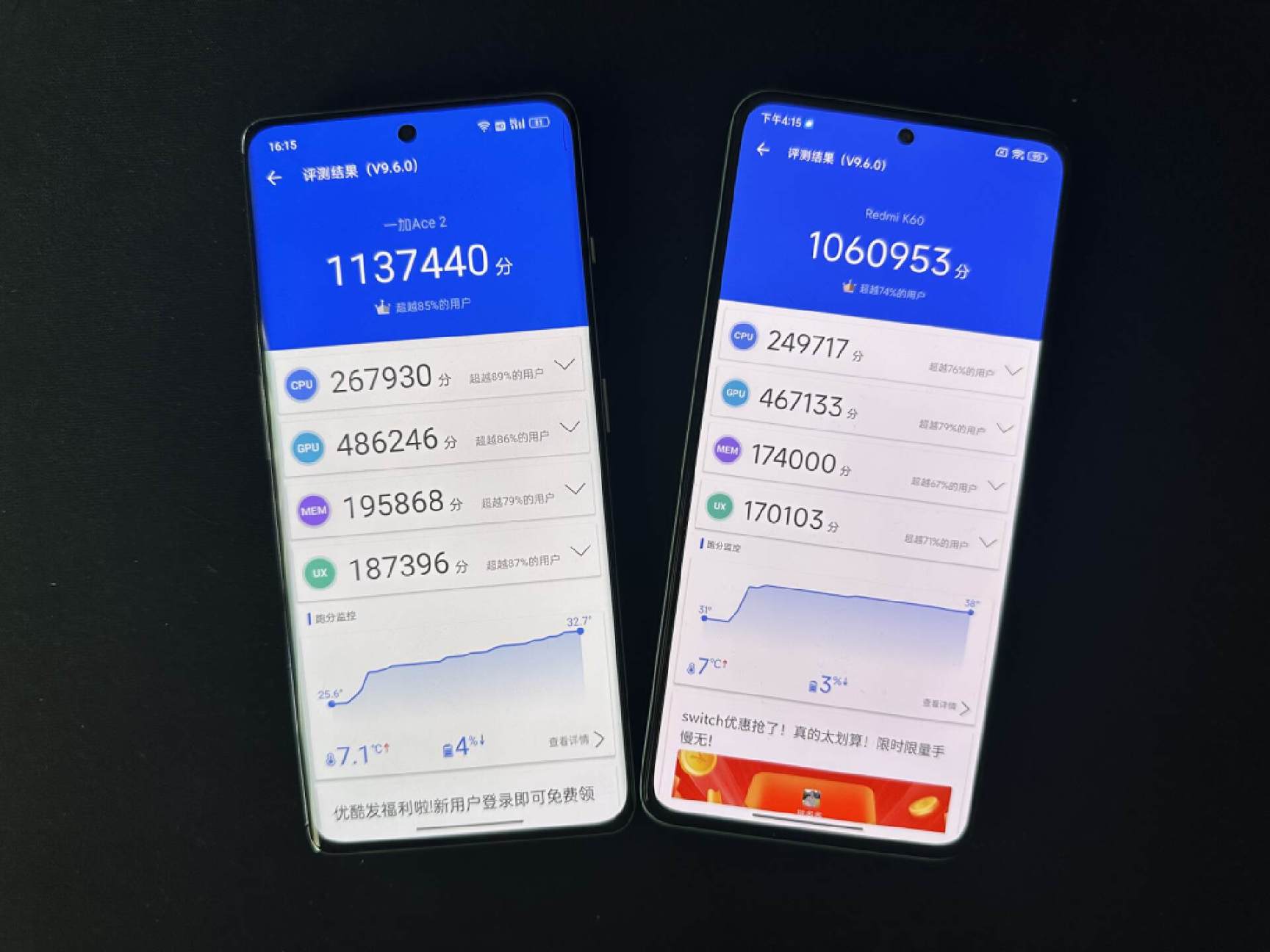 性能還是直接用跑分來體現吧,一加Ace2安兔兔跑分113萬,紅米K60跑分106萬,CPU、GPU表現上一加Ace2都要比紅米K60,這也是滿血版驍龍8+對比降頻版的性能優勢。內存分數差距也在2萬分以上,一加的LPDDR5X內存性能優勢也很明顯。