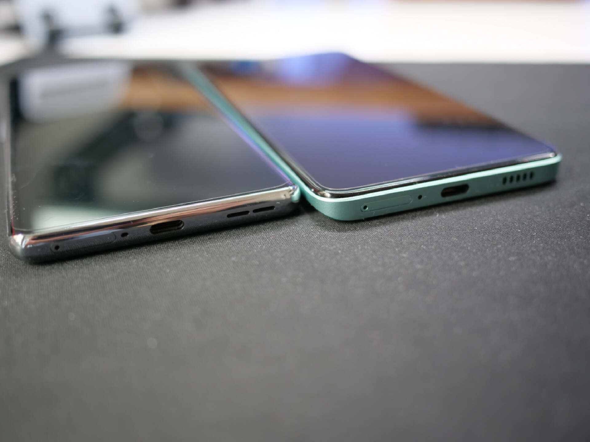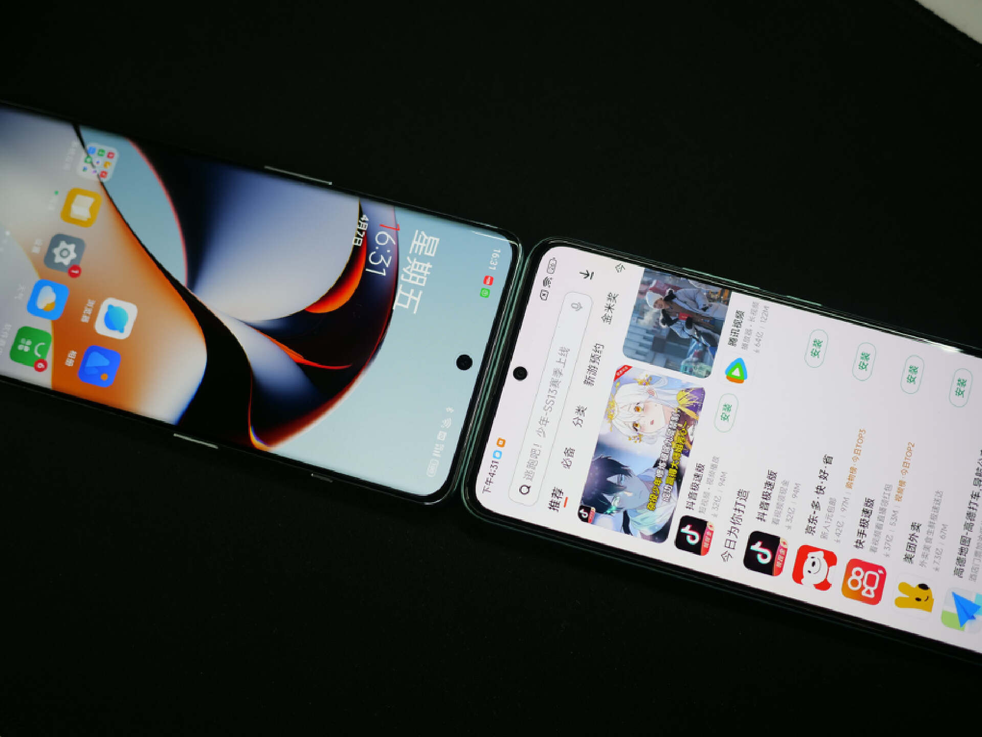 正面對比,同樣都是中置挖孔屏,一加採用的是曲面屏設計,跟後蓋曲面一致,紅米K60則是直屏設計。使用手感上一加Ace2明顯要更好一些,但是曲面屏還是直屏有時候也看個人喜好。
