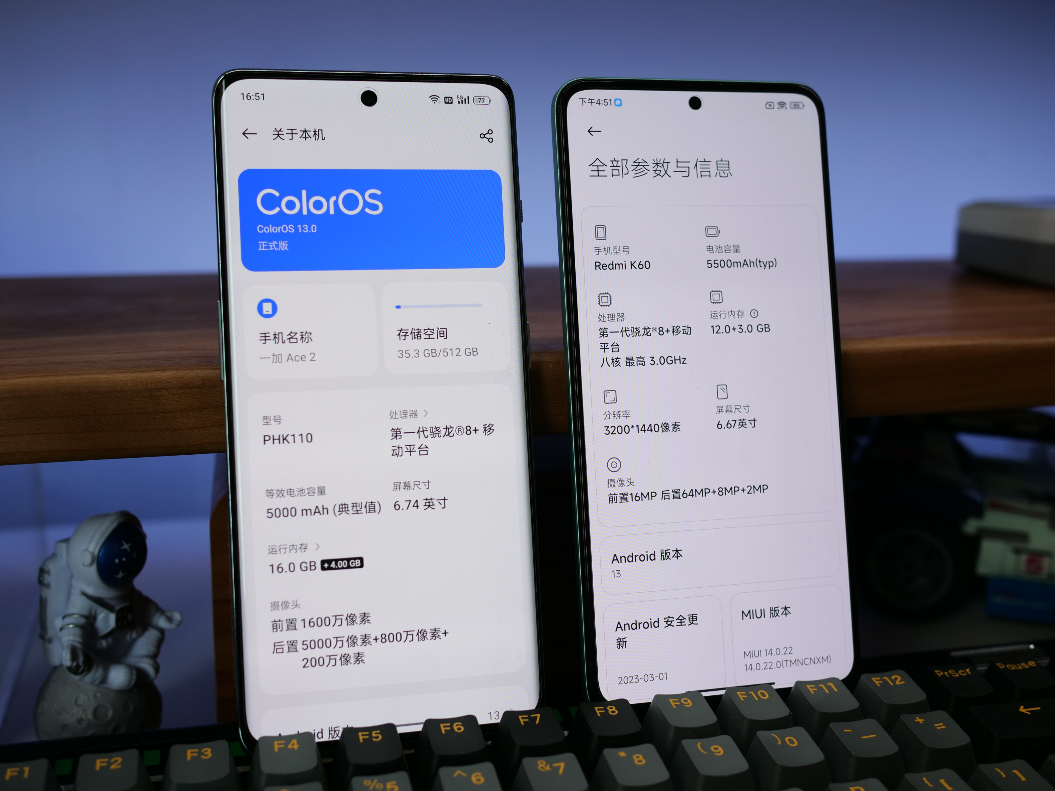 後攝模組對比,紅米K60採用了一枚帶光學防抖的6400萬像素OV64B主攝、800萬像素超廣角和200萬像素微距鏡頭。一加Ace 2的攝像模組則包含5000萬像素主攝(索尼IMX890+OIS光學防抖)、800萬像素超廣角和200萬像素微距鏡頭。雖然紅米K60的主攝像素看着要高一些,素質屬於千元機級主攝,實際一加Ace2採用的索尼IMX890素質要更強,屬於旗艦級主攝,在同價位基本無機可比。
