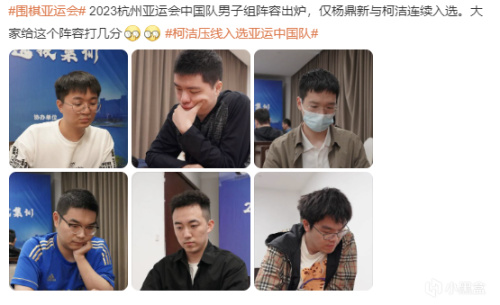 2023年5月18日,亚运会选拔赛最后一轮,柯洁以4胜5负的战绩,凭借小分的优势,惊险来到第六名,压线入选亚运国家队!目前,日本男队由井山裕太、芝野虎丸和一力辽领衔,韩国男队由申真谞、朴廷桓和卞相壹领衔,中日韩将在杭州角逐亚运冠军!