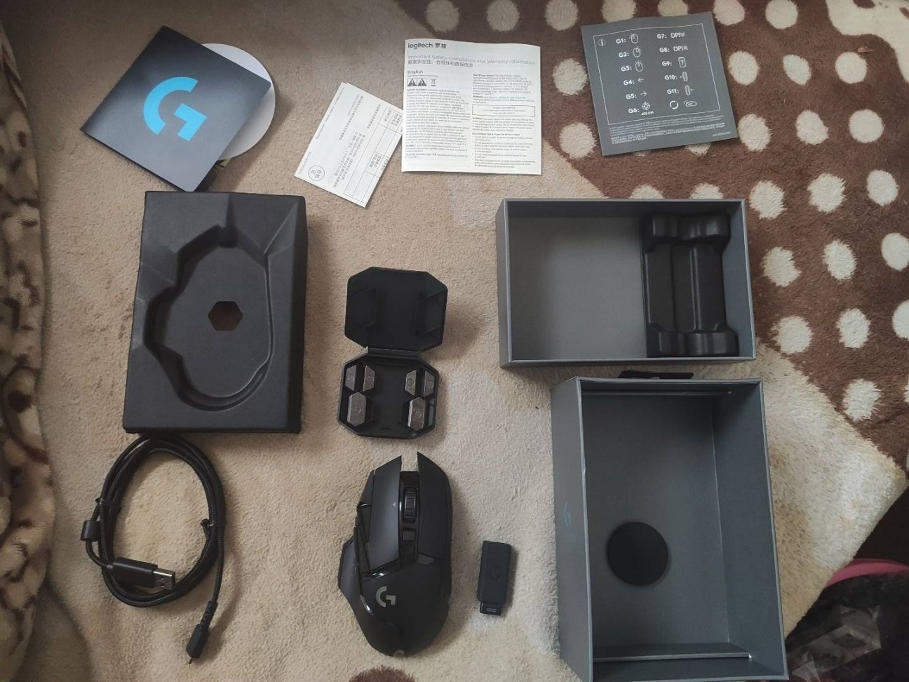 终于在某个睡不着的夜晚下单了G502,快递很快。三天后,小哥就送到了我的手中。当初还在怀疑是不是徒有虚名,但是不得不说G502光从外观上就很不错。刚开始零配重还有点不适应,鼠标有点难以拖动,不过好在我的dpi是1200但也有点适应。