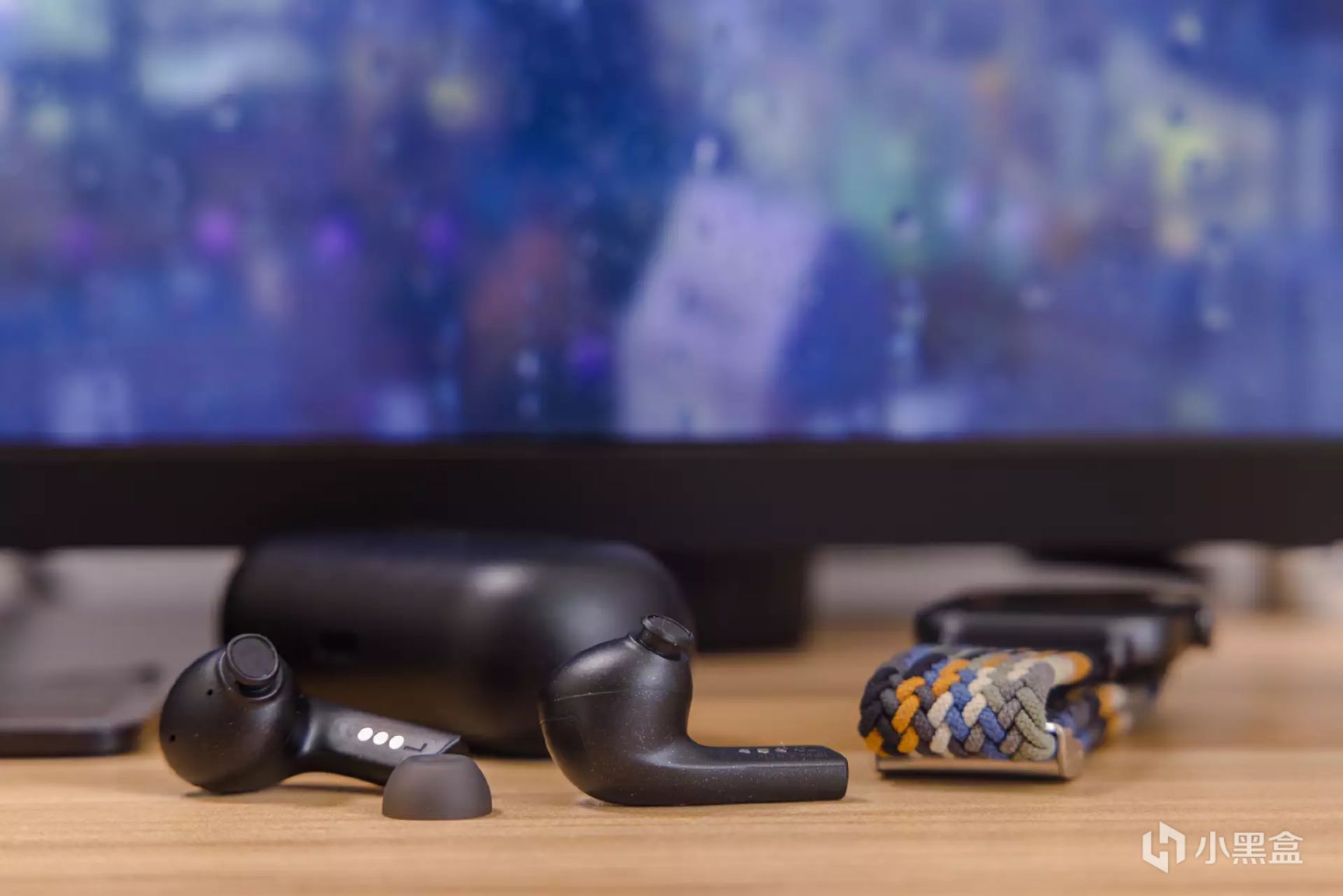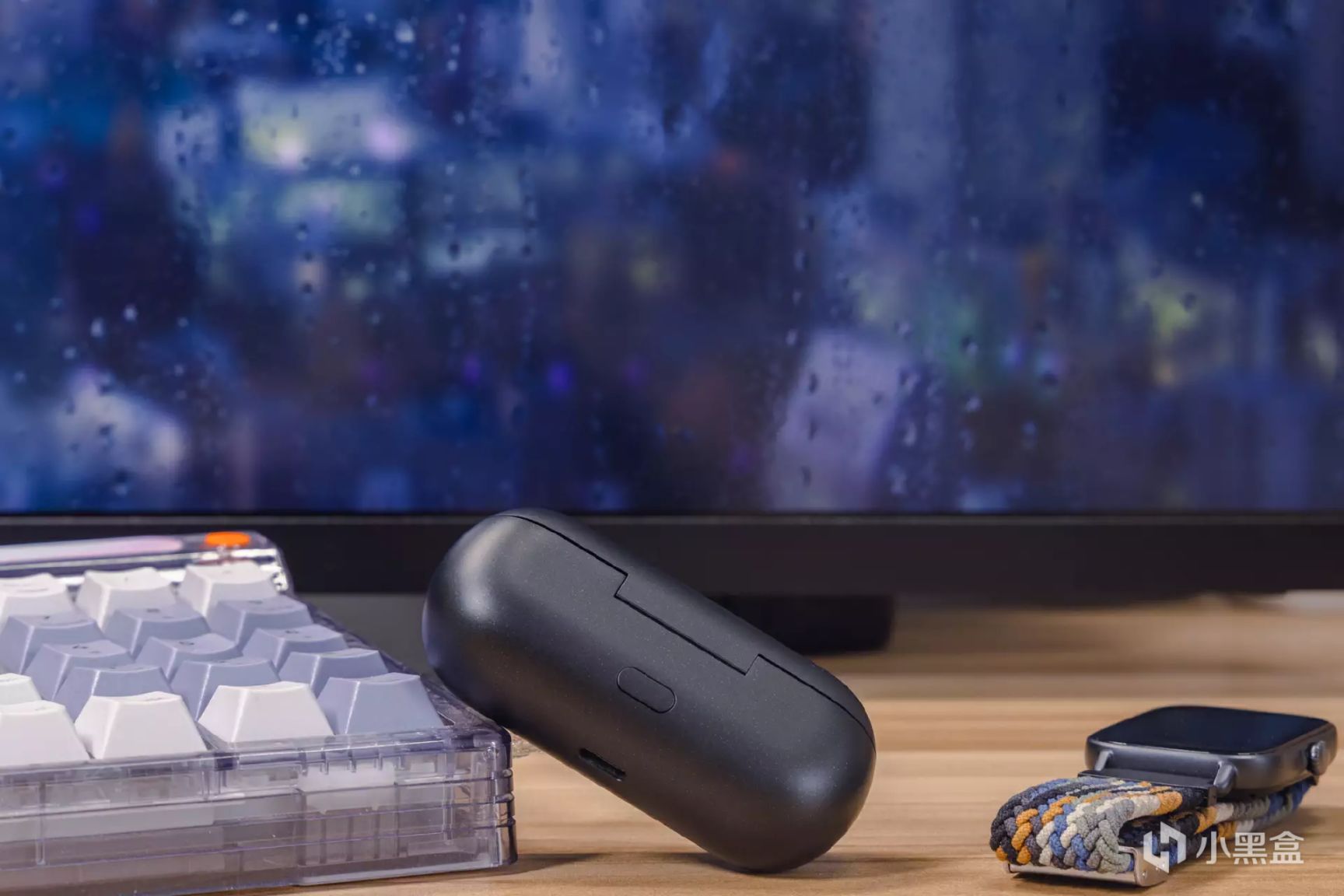 充电收纳仓壳体采用略带亮点颗粒的细磨砂设计,既避免了纯黑色机身有些过于单调,又提升产品的质感表现。收纳仓正面布置有一枚状态指示灯,可以根据指示灯的颜色对耳机电量有一个直观的了解。