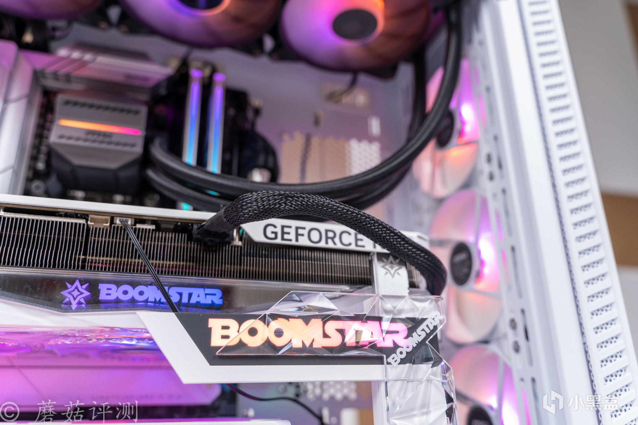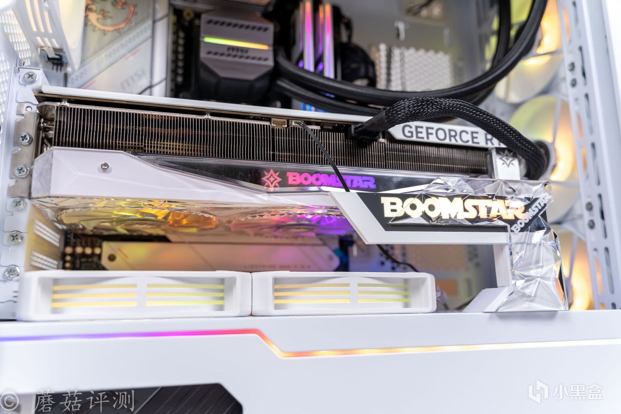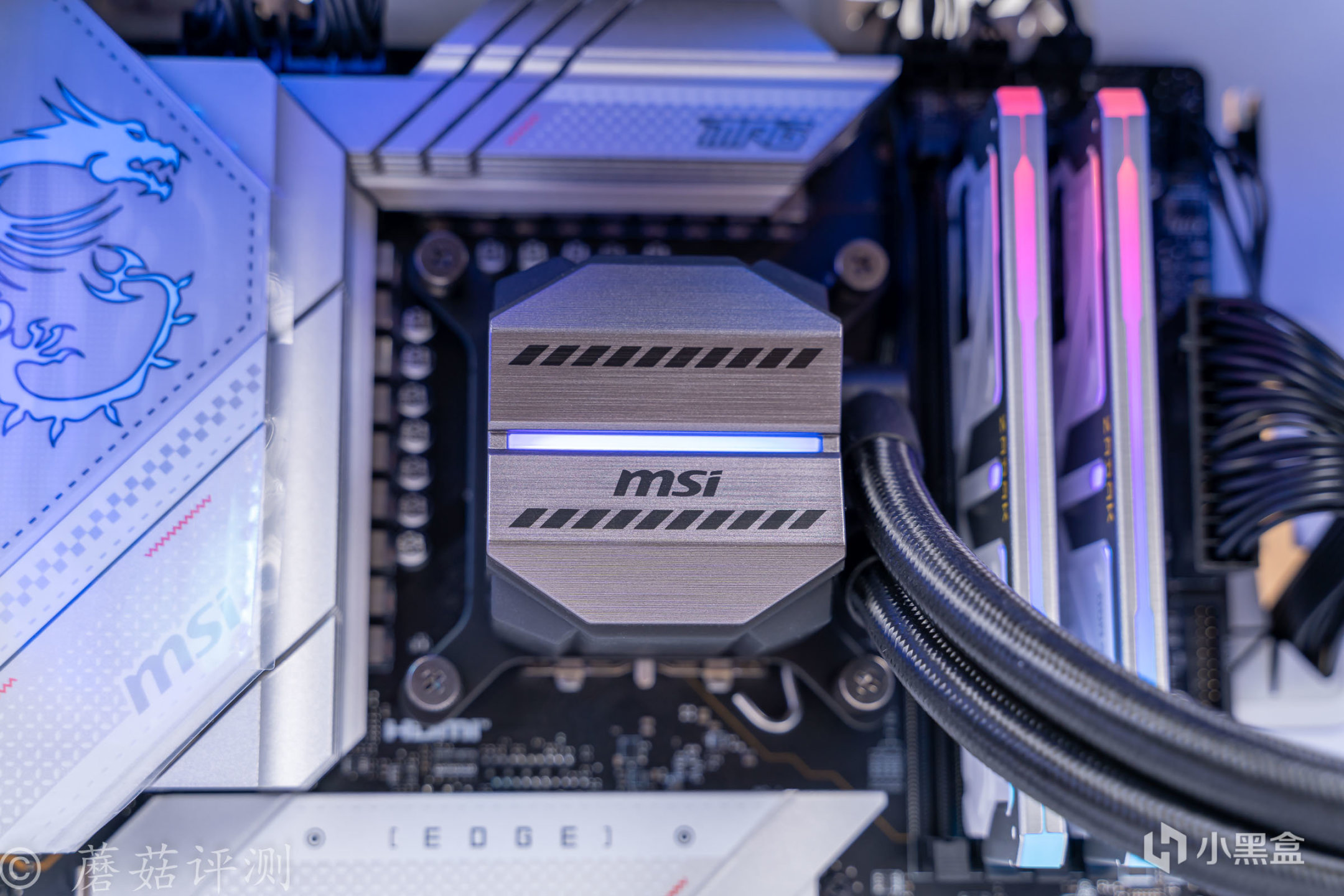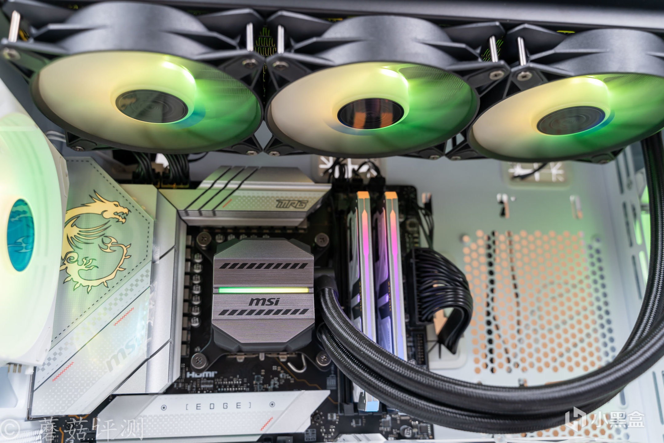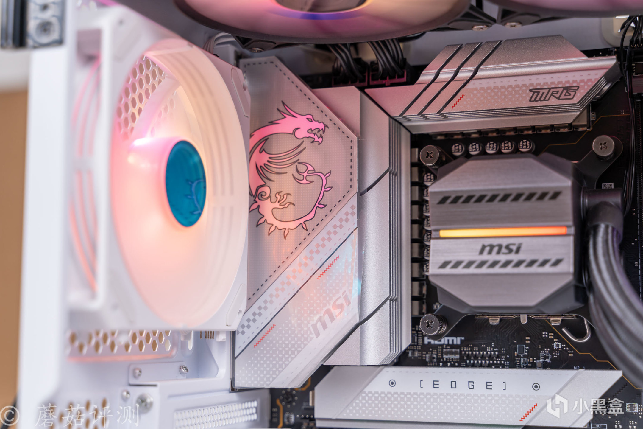 ▼水冷头的外观设计很有意思,熟悉的微星的迫击炮的涂装风格。冷排风扇部分也支持ARGB灯效,支持主板同步,风扇的扇叶是乳白色的,有柔光效果,整体的质感很棒。