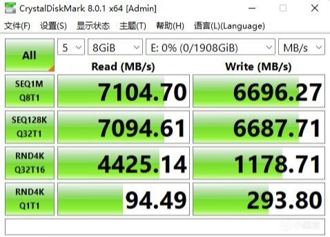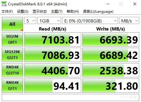 ▼跑个DiskMark测试,测试文件大小1GB,顺序读取速度7103MB/s、写入6693MB/s,4K读取94MB/s、写入321MB/s,顺序读取速度表现非常不错,轻松超过7000MB/s。