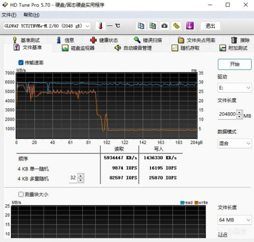 ▼再跑一遍200GB文件的读取和写入测试,可以明显看到SLC Cache的容量在90GB左右,缓外的写入速度在1000MB/s左右,表现也非常不错。