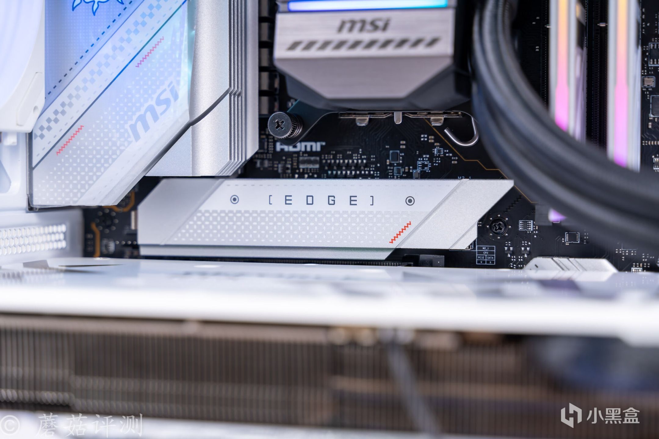 ▼主板是微星的Z790刀锋D5,这块主板最上面的M2插槽支持快拆,把金属散热片左侧的拨片轻轻一按,就能轻松取下,拆装固态非常方便。并且其散热采用的是上下双层散热,都有导热垫覆盖。