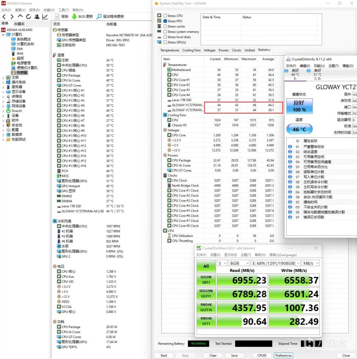 ▼接着跑DiskMark测试,测试文件大小8GB,可以看到固态硬盘的最高温度在46℃左右,发热表现非常不错。