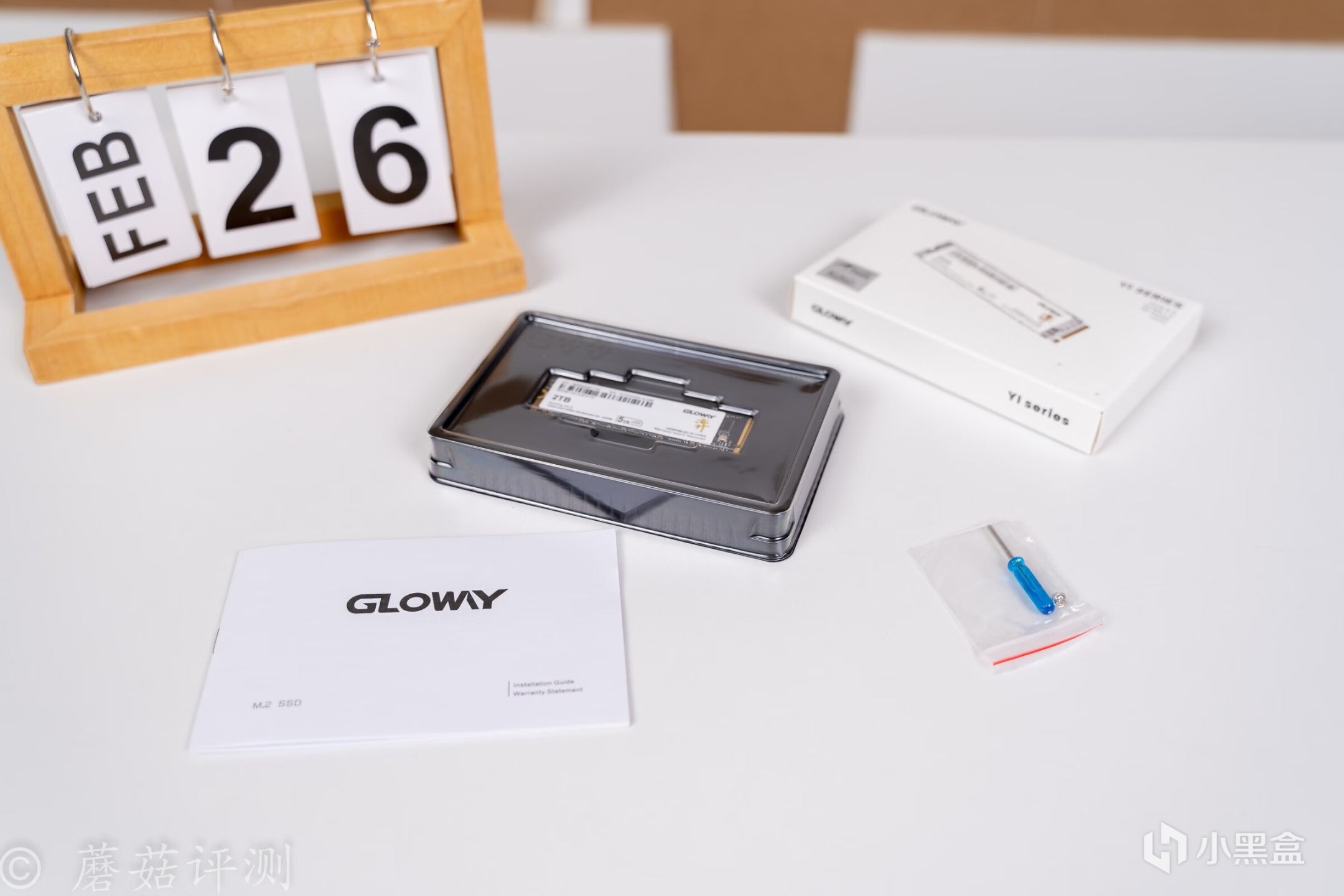 ▼纸盒内,固态硬盘被塑料壳固定的很牢固,还有一本说明书、一把螺丝刀和固定螺丝。