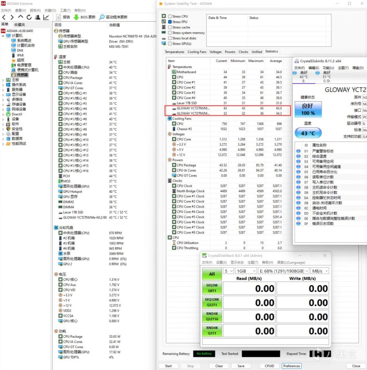 ▼最后是散热测试,室温在27℃左右,日常待机情况,固态硬盘的温度在43℃左右,表现非常稳定。