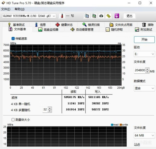 ▼接着跑个200GB文件的读取写入,空盘状态,写入速度可以轻松保持在5000MB/s左右,读取速度要更快,可以去到6000MB/s。