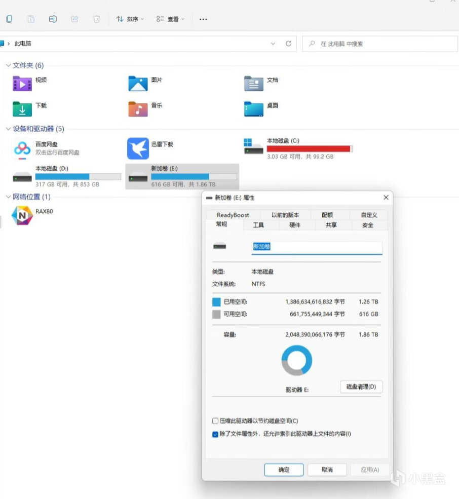 ▼标称容量2TB,实际可用容量在1.86TB左右,还不错。