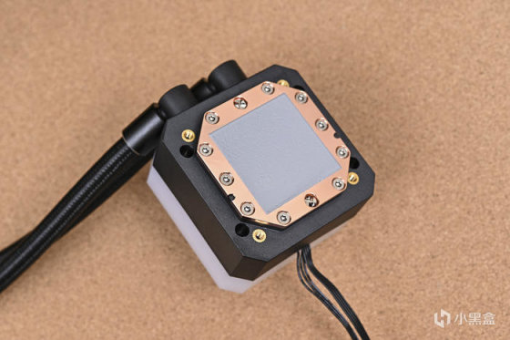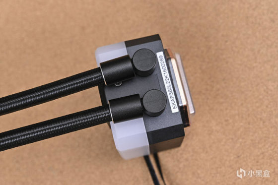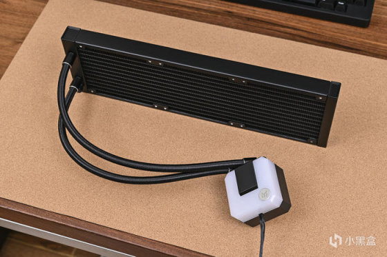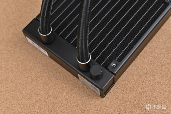 取出水冷本体。水冷通体黑色,水冷管接口采用铝合金材质,低调但又不失质感。水冷管经过特殊设计,为易弯曲高分子 FEP 编织管,工业级密封工艺,耐腐蚀、抗氧化,双层保护更加耐用。