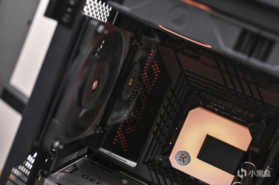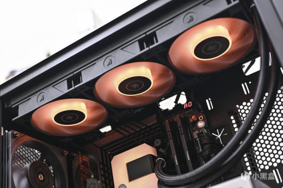 冷排上的 3 颗 EK-FPT FAN-120 D-RGBV2 风扇等效展示。