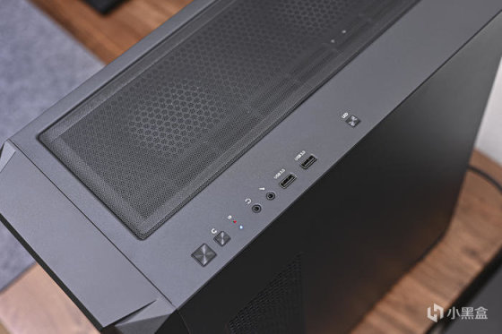 机箱前置 I/O 在顶部面板右侧前端,从前到后分别为:1x 电源键、1x 重启键、1x电源&HDD 指示灯、1x 3.5mm 单孔耳机音效孔、1x 3.5mm 单孔麦克风音效孔、2x USB 3.0 TypeA 5Gbps、1x LED 灯效切换按钮。