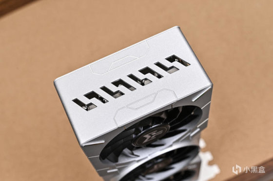 显卡侧面展示。影驰 GeForce RTX 4070 Ti 金属大师 OC 采用压铸铝合金一体成型上盖,全覆盖设计,大幅提升散热面积,侧面两侧长条开孔可以看到大量的散热鳍片。