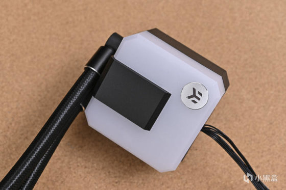 水冷头方面采用乳白色柔光罩+黑色嵌心设计,右下角为金属银色拉丝 EK 火字 Logo 点缀,整个冷头具备 ARGB 灯光特效,支持各大厂商主板神光同步。冷头内采用双腔体高性能 PWM 水泵设计,转速可达 3300rpm±10%,结合 0.1mm 微水道铜底,散热效率更高、使用寿命更长。