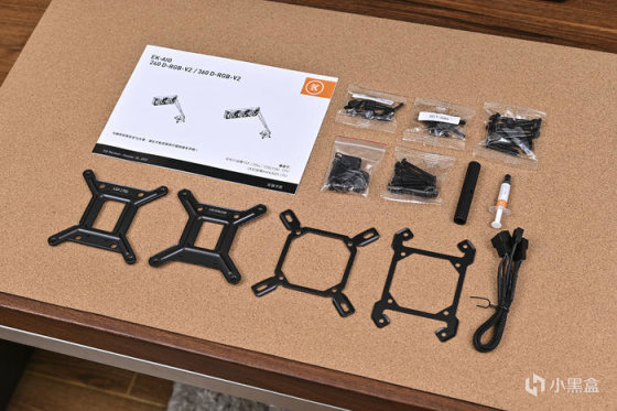 盒内包括一本非常厚实的多国语言安装说明书,丰富的各平台扣具一应俱全,最新的 intel LGA 1700 以及 AM5 均全面支持,内含:风扇螺丝 x4、全牙风扇螺丝 x4、水冷排螺丝 x4、扣具螺丝 x4、intel&AMD 螺杆螺丝 x4、LGA20XX 螺杆 x4、扣具螺母 x4、 螺杆套筒 x1、导热膏 x1、风扇转接线 x1,包内包含:LGA115X&1200 背板 x1、LGA1700 背板 x1、intel 支架 x1、AMD 支架 x1 等。EK 一体式水冷拥有五年质保和漏液保险服务。