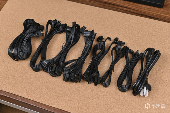 首先是丰富的全模组线材,线材均为橡胶扁平线设计,柔软易打理。原生 12VHPWR PCIe 线材, 支持 ATX3.0 和 PCIe Gen5 标准,可抵抗高阶显卡运行产生瞬间高峰功耗造成的断电,更稳定高效的提供高阶系统供电。