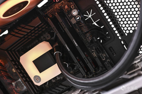 水冷头的进出水管同样做了铝合金加固处理,同样在末端高光倒角提高质感,加长的端子可以更加牢固的固定水冷管,避免泄露。纤细的管径也可以更好的兼容内存,避免遮挡。