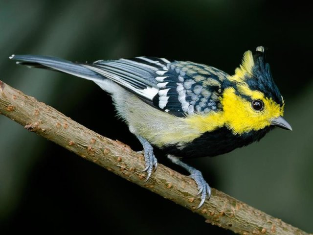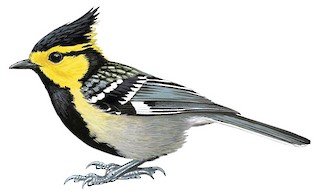黄腹山雀脸呈白色,头顶和羽冠呈黑色,前额、眼先、头侧呈鲜黄色,眼后有一黑纹。亮黄色的脸和颈背,与黑色的头顶、喉咙和胸部形成鲜明对比。