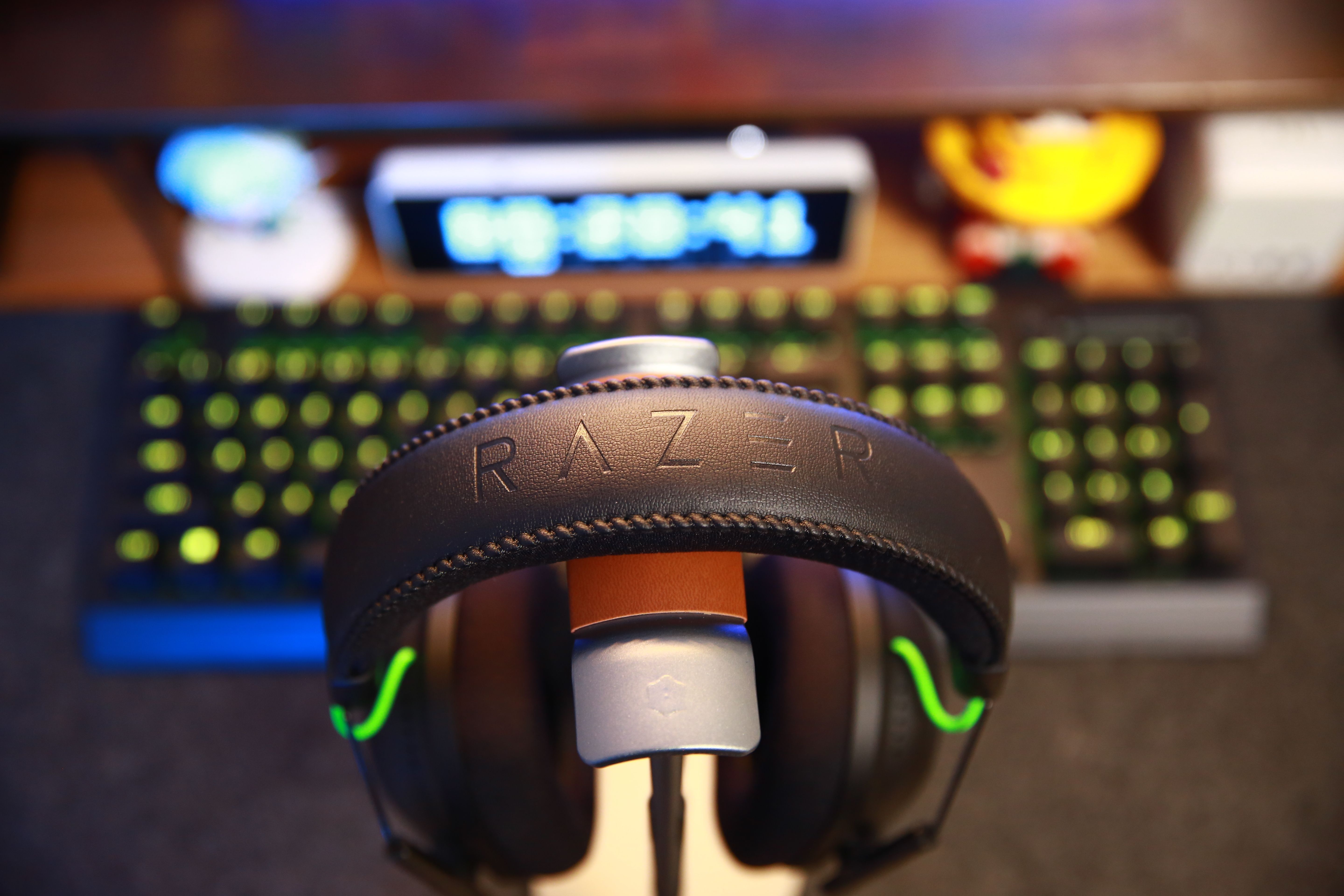 耳機頭梁外側由高級人造皮革材質包裹,上面印有RAZER的品牌LOGO。邊緣的縫紉走線規整,整體相當協調,辨識度也很高。