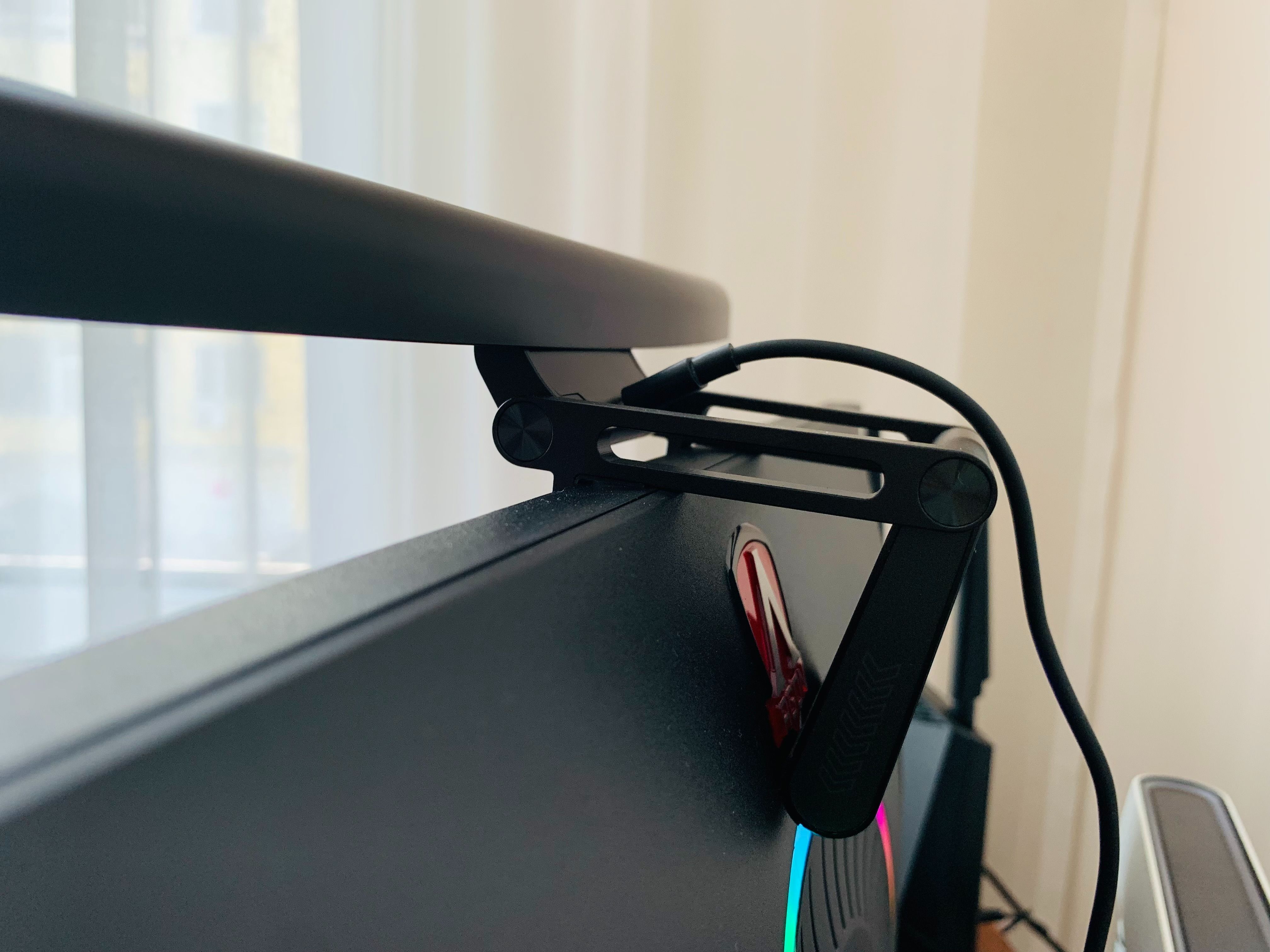 VFZ屏掛燈內置80顆燈珠,採用45°非對稱光源設計,這款是曲面屏幕掛燈,可以適配1000R-2000R區間的曲面屏,同樣也適用於直面屏。