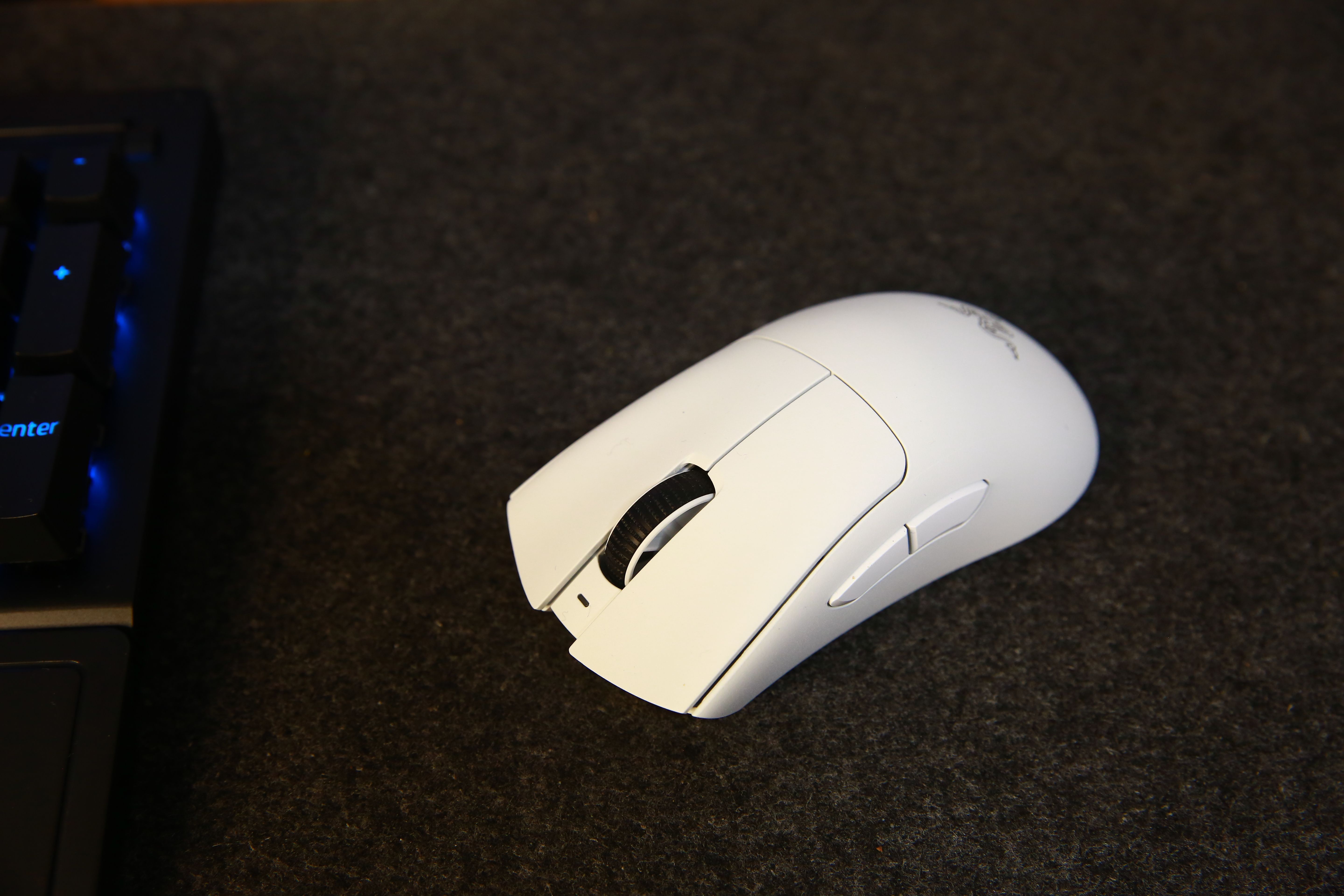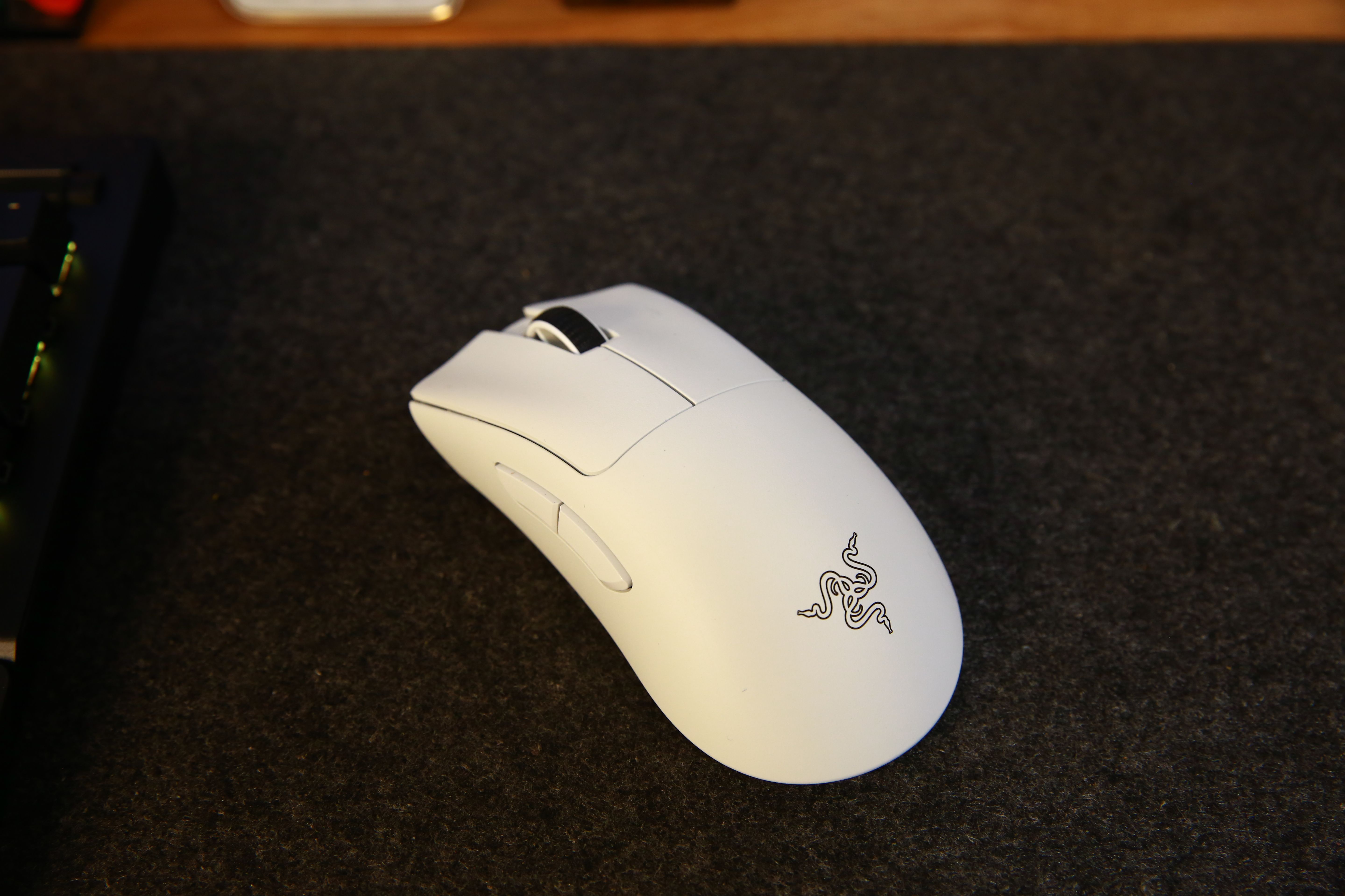 煉獄蝰蛇V3 Pro採用非對稱設計,比較適合大手用戶,握持手感舒適,表面是微微的磨砂效果,不易沾染汗漬和指紋。爲了減重,取消了雷蛇標誌性的LOGO燈組,少了一點味道,不過也延長了電池使用時間。