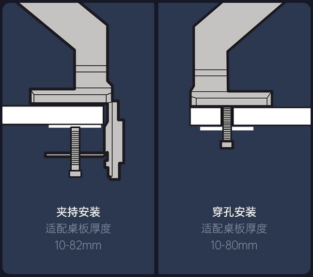 E700的安裝方式支持目前主流的兩種安裝模式:穿孔安裝和夾持安裝,兩種安裝方式都很穩固,因爲我的桌面是整張木質桌板,並沒有預先打孔,所以採用了夾持安裝。