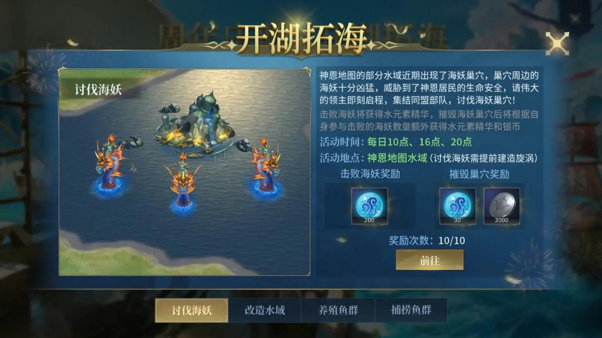 週年慶典活動中首先應該被提到的項目自然是慶典上線的全新限時活動”開湖拓海“,玩家們可通過參與活動獲取水元素精華,利用其力量完成開湖拓海的壯舉。活動期間,玩家還可養殖魚羣,領取豐厚獎勵。