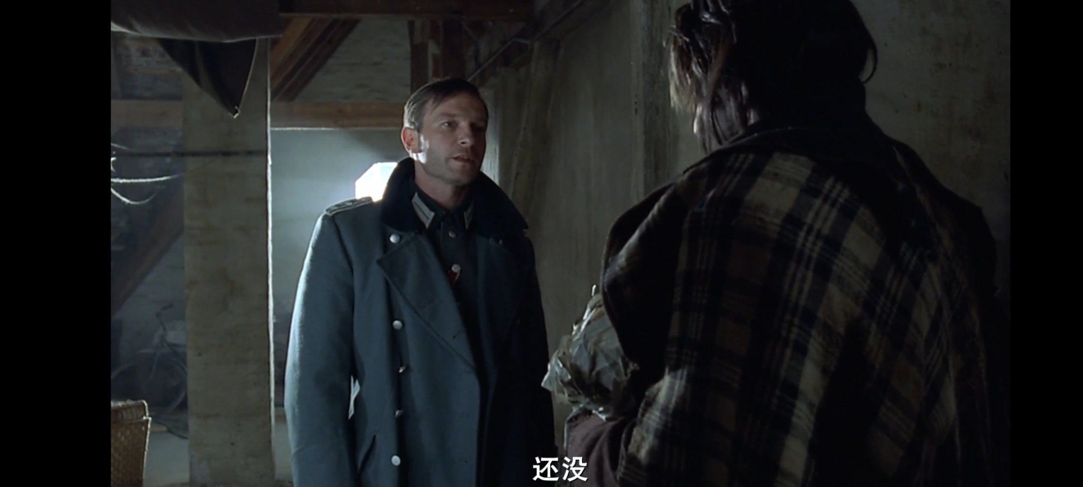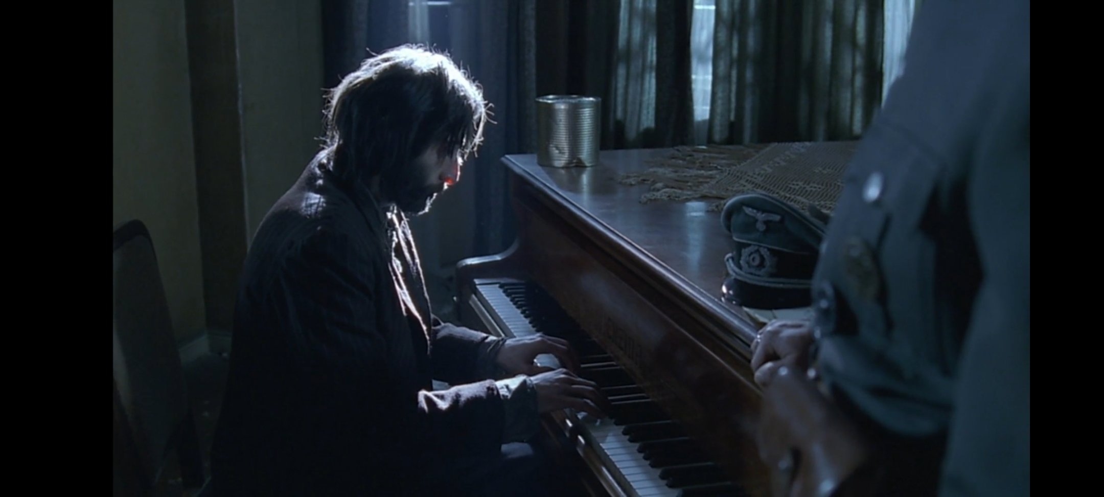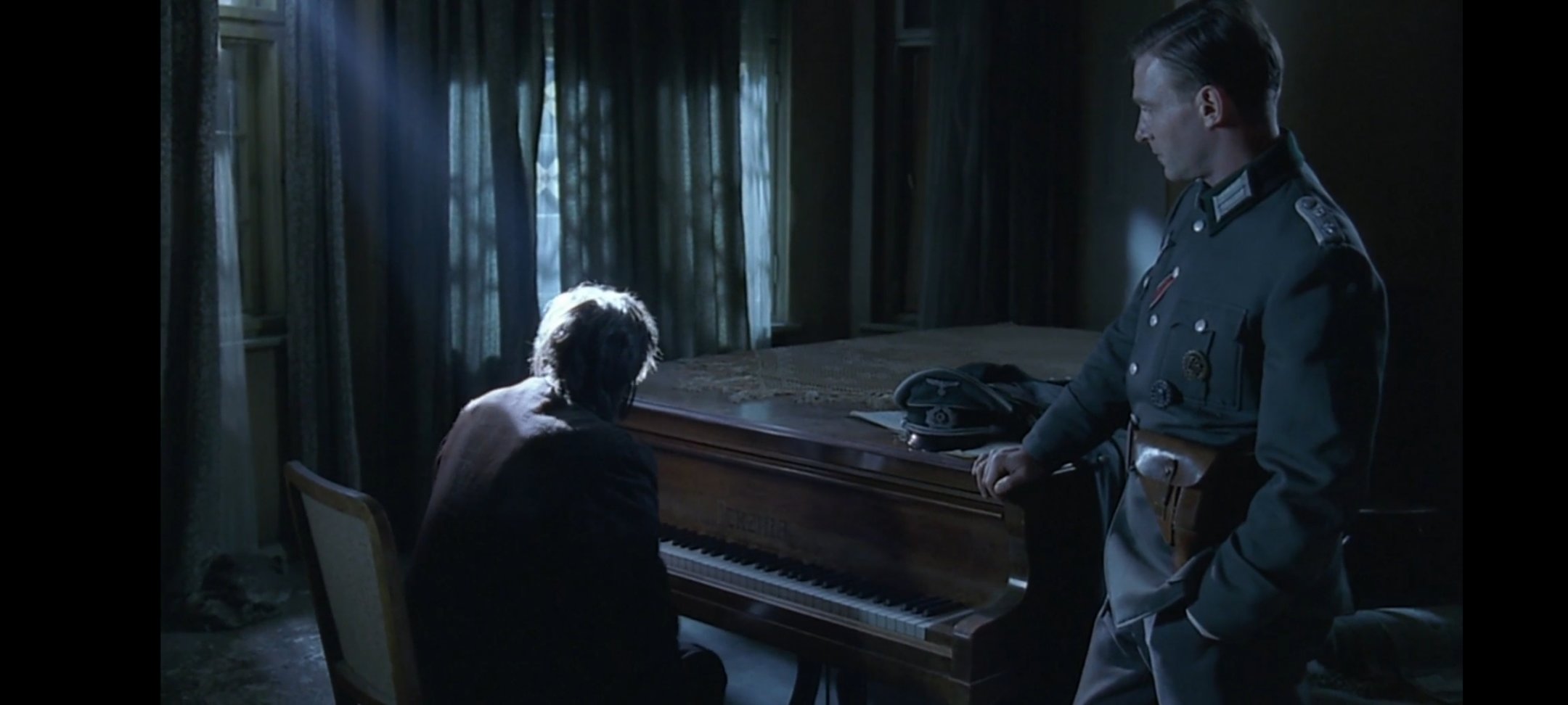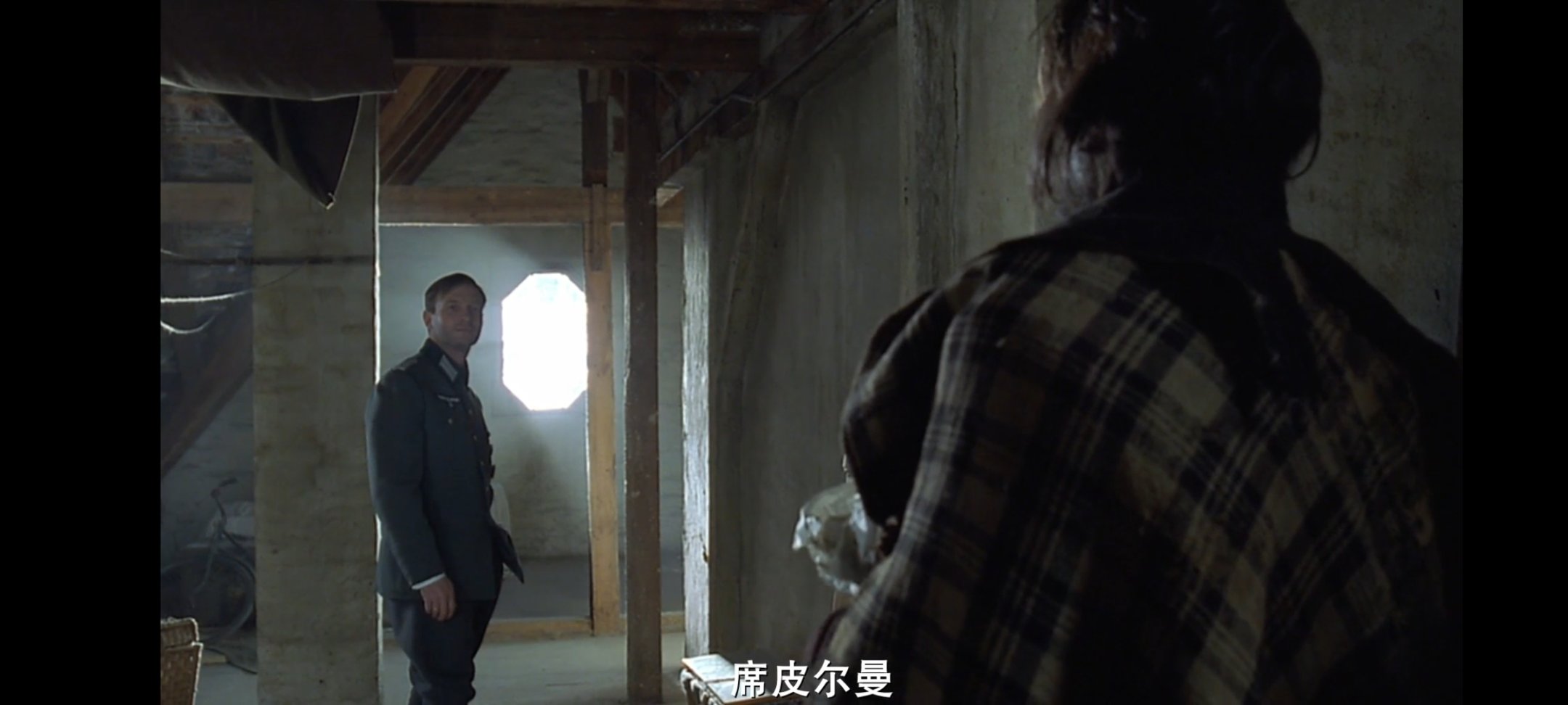 德国军官将他藏匿,给他提供了食物与水,甚至给了他一件自己的军大衣御寒,不知是临时起意,还是有心为之,此时此刻于战场上释放出来的人性的光辉能够感染着这两个人,德国军官还问了他的名字,问他战争后想做什么,"我想我会在波兰电台继续弹钢琴"。军官说"我会成为你的听众之一"。