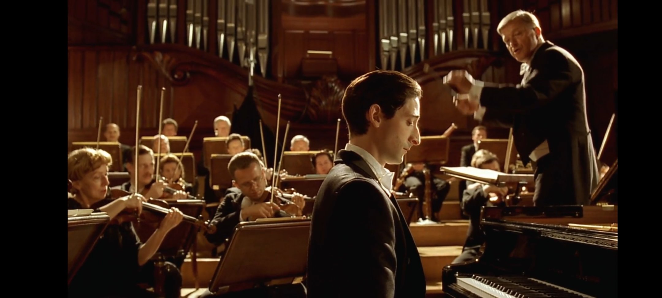 他已经好几天没有吃过任何东西,他双手颤抖抚摸这琴弦,仿佛下定了决心一般,将眷恋与柔情舍弃,带着全身的遍体鳞伤,将心中的光彩投射到手上,投射到琴弦上,铿锵有力的演奏了[肖邦]的《G小调第一叙事曲》,曾经弹琴的手指伤痕累累,但是演奏出的音乐依然可以令德国军官为之拜服。